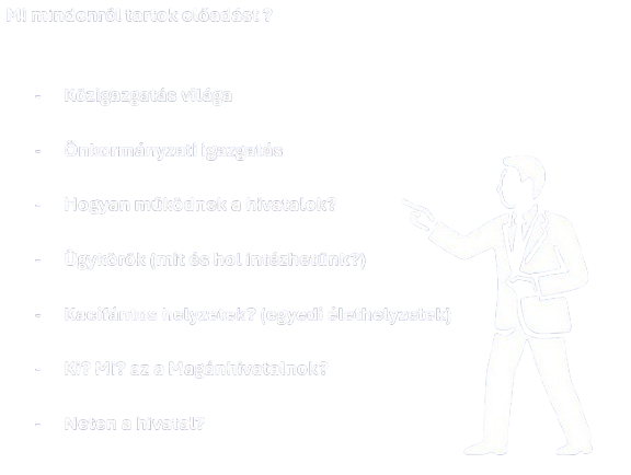 Célom, hogy érthető, barátságos módon adjam át a szükséges tudást, amely lehetővé teszi a résztvevők számára, hogy magabiztosabban intézzék hivatalos ügyeiket.